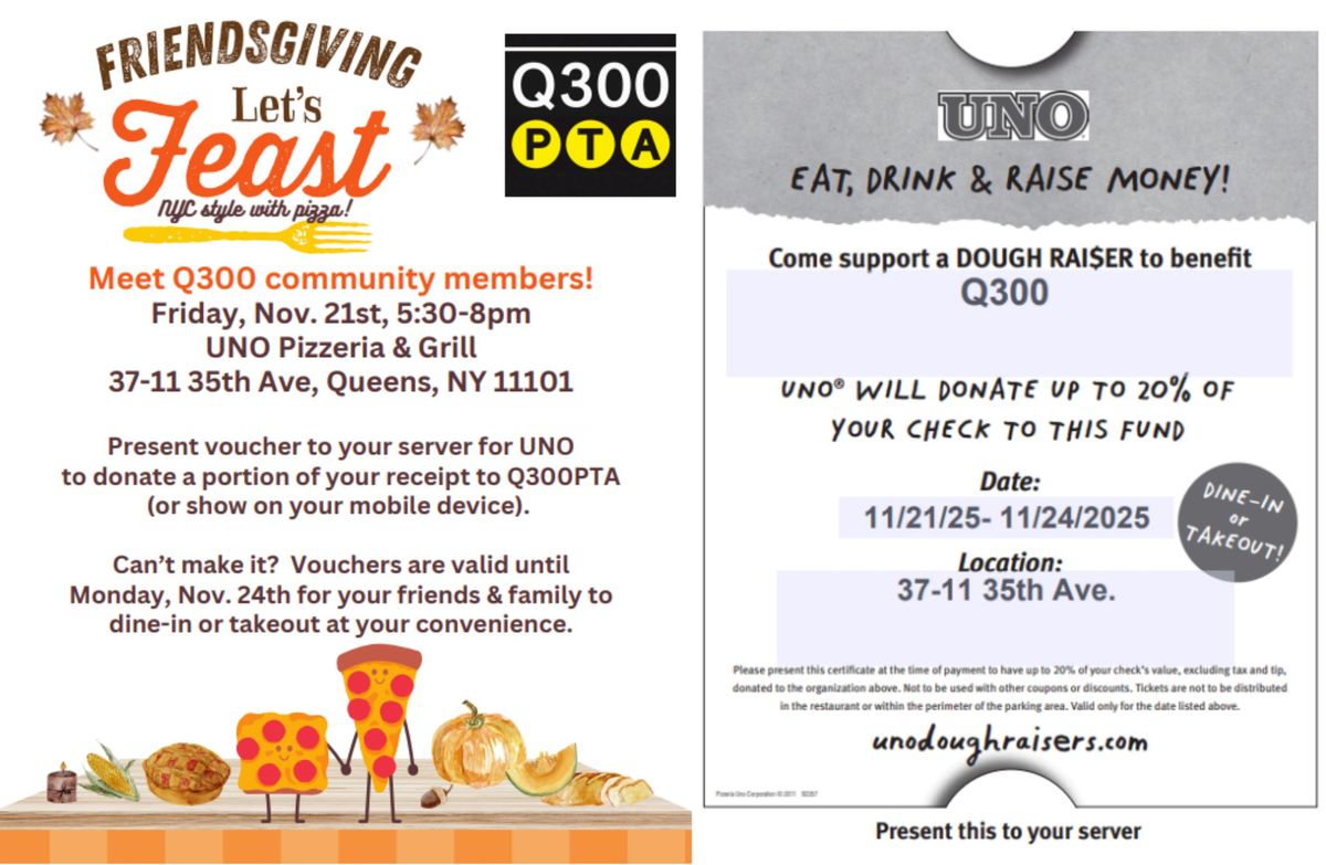 Save the date for the Q300 Friendsgiving at UNO Pizzeria & Grill in Astoria! Enjoy some pizza, help raise money for our school and mingle with our Q300 community at the same time. All are invited, including families, friends, teachers, and staff! Let’s come together in the spirit of gratitude! More info to come. See […]