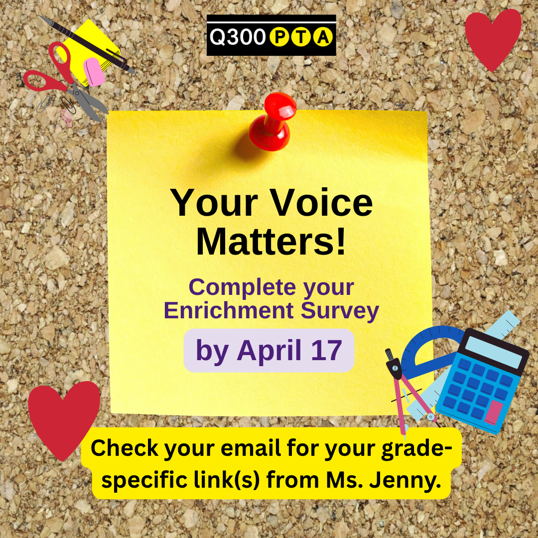 The Q300 PTA provides funding for enrichment programs, school equipment and supplies, teacher professional development, and personnel such as teaching assistants — all of which serve to deepen the educational experience of our Q300 students. We cordially invite you to provide your feedback on PTA-funded enrichment programs for this year and for the 2026–2027 school […]