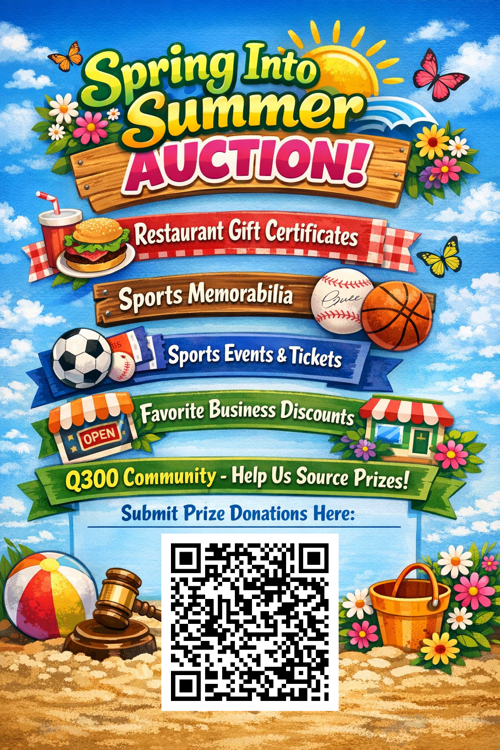 The Q300 PTA is excited to host our Spring into Summer Silent Auction and we need your help to gather great prizes! This event is a major fundraiser that supports programs and resources that benefit every student at Q300 and your donations make it possible.